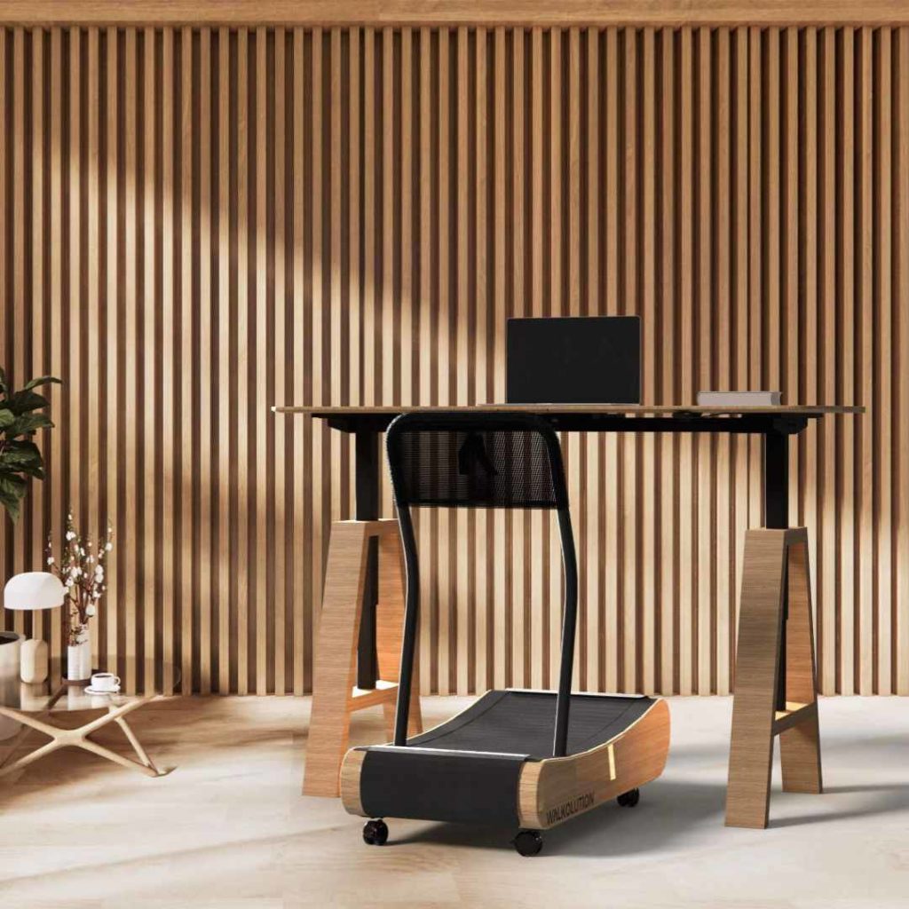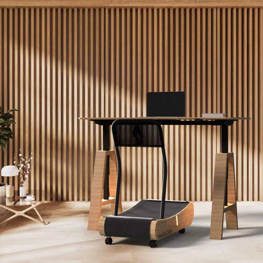 The treadmill and the desk are made of FSC-certified beech wood from Germany. The walking surface is made of stable birchwood slats, which provide a natural and elastic walking feeling. A scratch-resistant, pleasantly soft coating is applied to the walking surface, which also provides a calming acoustically absorbing effect. The slats glide with just the right amount of resistance on high-quality ball bearings and the inner frame is a solid steel construction that can withstand any load.