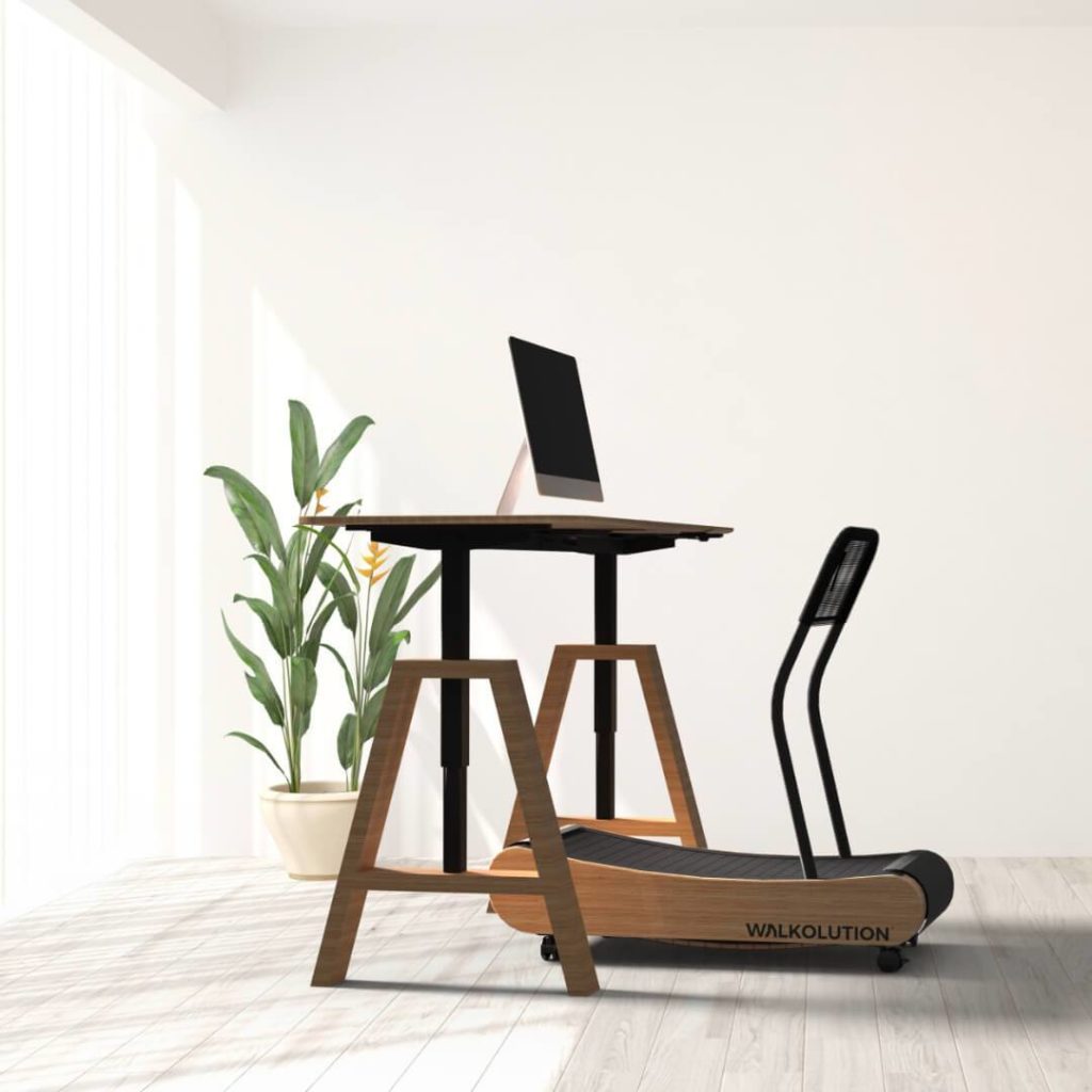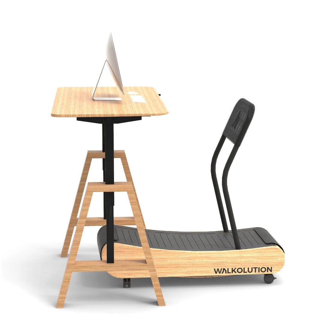 The included stable electrically height-adjustable desk, which is made of the same wood as the Walkolution treadmill, provides you with plenty of space at a depth of 80cm and a width of either 120 cm or 180 cm. In addition to the height adjustability, the desk also has the unique feature of a stepless depth adjustability. This allows you to pull the desktop towards you when leaning against the standing aid.