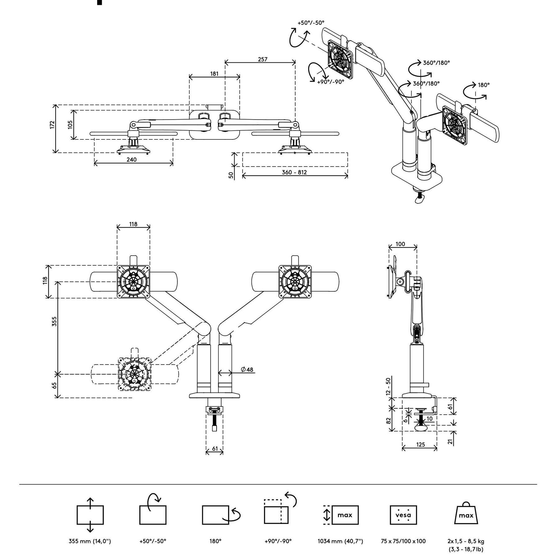 • Weight capacity 1,5 – 8,5 kg (3,3 – 18,7 lb.) per monitor • Monitor size limit: width 812 mm, height 1034 mm